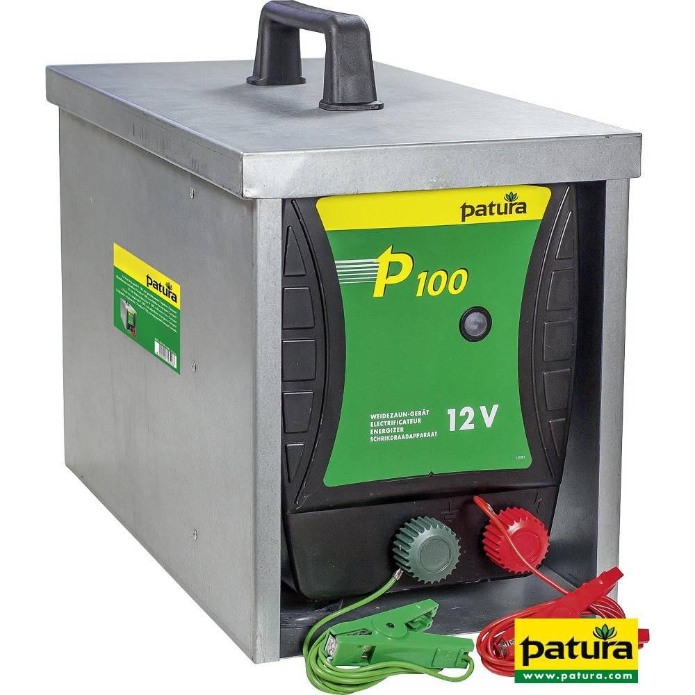 P100 met afgesloten draagbox Compact (max. 84 Ah Akku)De prijsknaller onder de 12 Volt apparaten, voor kleine afrasteringen voor rundvee, paarden en huisdieren; bijna leeg beveiliging voor langste batterij levensduur; incl. kabelset