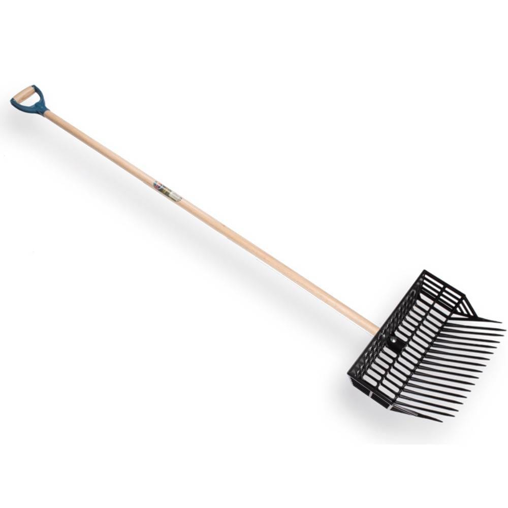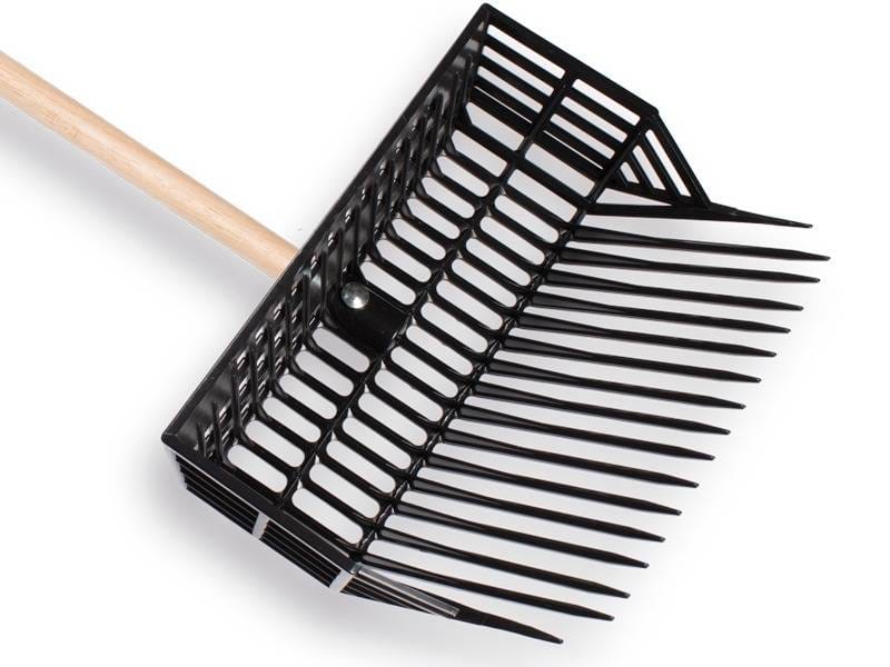 Deze vork is geschikt voor het verwijderen van natte plekken en paardenvijgen en heeft achteraan de vork een korf, waardoor paardenvijgen en stro gemakkelijk op de vork blijven.